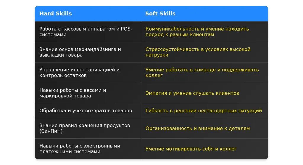 Навыки должны быть перегруппированы так, чтобы наиболее важные для вакансии компетенции находились в начале списка. Например, если в вакансии упоминается работа с кассовым оборудованием, этот навык должен быть выделен.