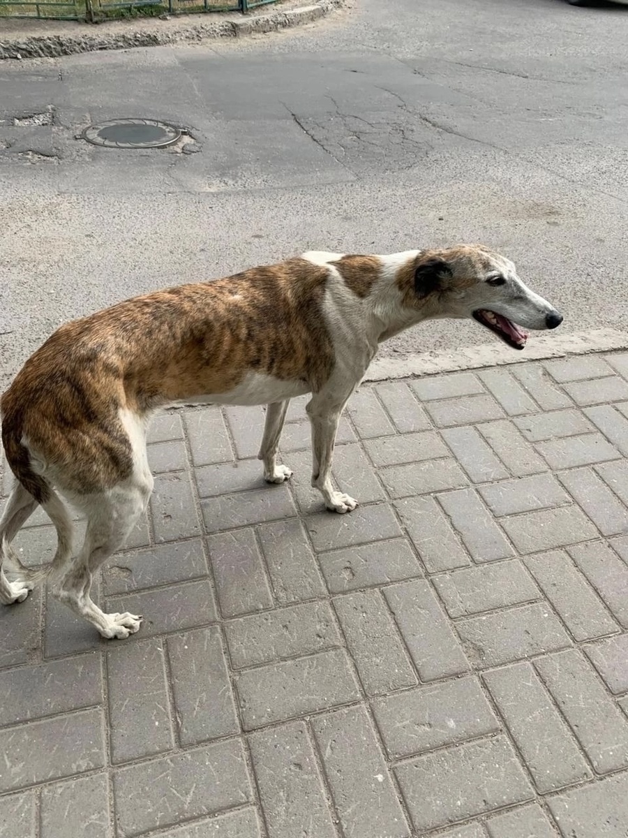 Собака без клички. Живёт уже пару лет в жилом районе, как появилась никто не знает. Ест на мусорке, спит у подъездов, но другие собаки её обижают.