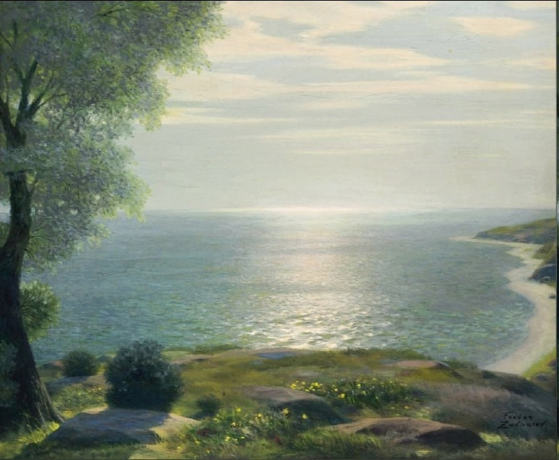 Раннее утро на берегу моря – это всегда миг особой тишины и гармонии, когда солнце ещё не вступило в полную силу, а воздух наполнен свежестью и прохладой. Атмосфера этого состояния передана на полотне Федора Захарова «Летнее утро у моря», созданном в 1906 году. На картине морской пейзаж открывается зрителю в утончённой и нежной гамме оттенков. Художник с деликатностью передаёт рассеянный свет восходящего солнца, мягко озаряющего морскую гладь и слегка затрагивающего прибрежные растения и цветы. Море кажется неподвижным и зеркальным, отражая приглушённые краски неба, создавая ощущение покоя и безмятежности. Передний план картины украшает композиция из дерева и цветущих кустарников, что придаёт картине уют и подчёркивает настроение раннего утра. Каменистый берег и нежные полевые цветы раскрывают перед зрителем спокойную красоту нетронутой природы, где каждый элемент пейзажа полон глубокого смысла и гармонии. Фёдор Захаров (1882 - 1968 гг.) известен как мастер пейзажа, чьи работы отличают