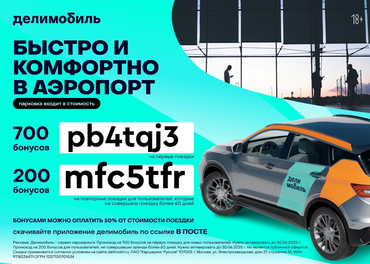 Её не нужно ждать — только выбрать на карте ближайший Делимобиль и ехать в своё удовольствие, да ещё и под любимую музыку. А вот бонусы на на скидку: 1. Скачивайте приложение https://delimobil.prfl.me/dmitriy_flegantov_blog/s0lm2l?erid=2VtzqvWvMN5 : 2. Вводите промокод в разделе бонусы и промокоды pb4tqj3 — 700 бонусов на первые поездки mfc5tfr - 200 бонусов на повторные поездки для пользователей, которые не совершали поездку более 60 дней 3. Оплачивайте до 50% поездки бонусами Реклама ПАО "Каршеринг Руссия" 107023, г. Москва, ул. Электрозаводская, дом 27, строение 1А. ИНН 9718236471 ОГРН 1237700701534