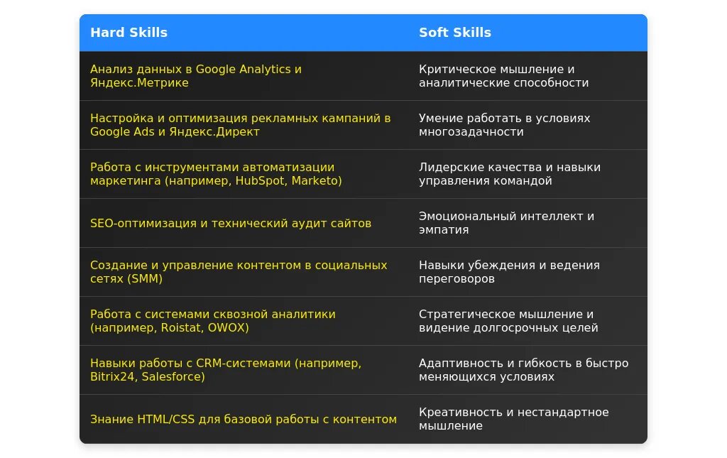При анализе вакансии важно выделить ключевые требования, которые разделяются на обязательные и желательные. Обязательные требования обычно включают конкретные навыки, такие как опыт работы с Google Analytics, настройка рекламных кампаний в Google Ads и Яндекс.Директ, а также знание SEO. Желательные требования могут включать опыт работы с CRM-системами, знание инструментов автоматизации маркетинга или опыт управления командой.