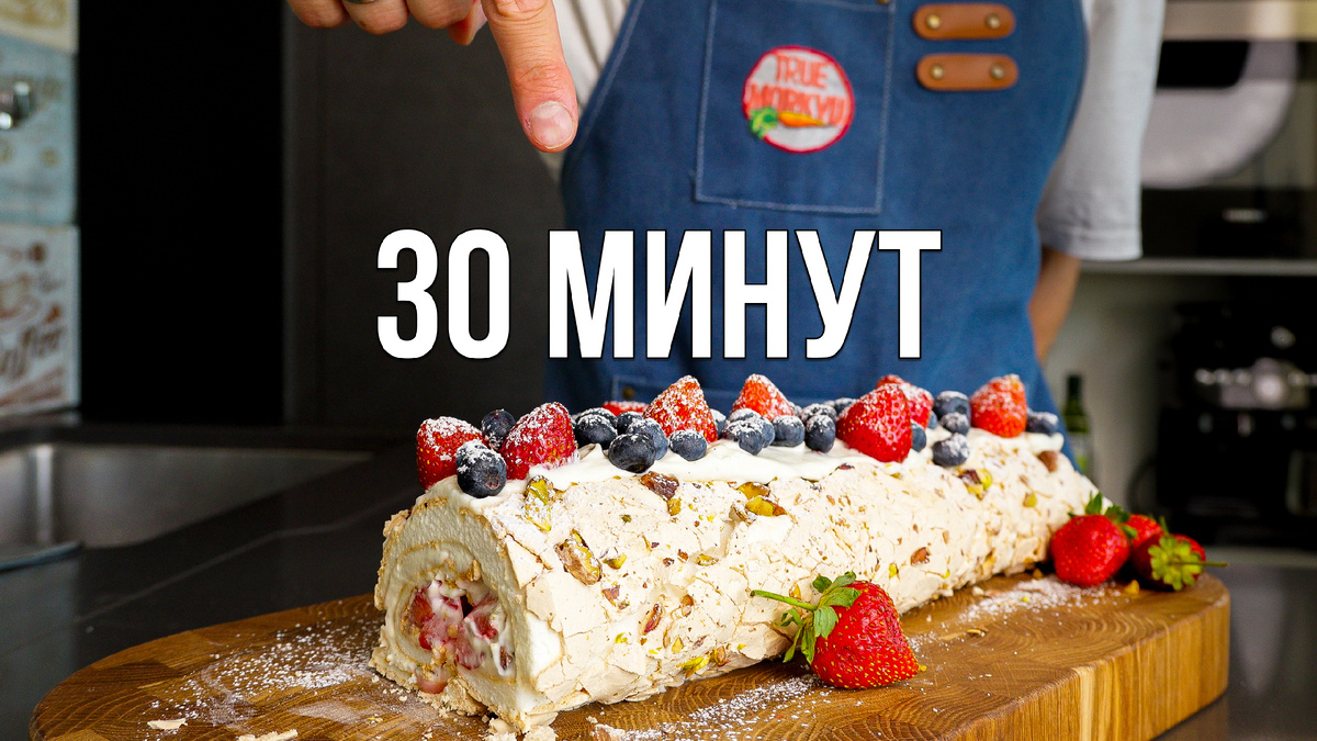- Достаньте меренгу, остудите пару минут, накройте пергаментом и переверните. Снимите пергамент, нанесите почти весь крем, посыпьте орешками и ягодами. Аккуратно сверните рулет, подворачивая пергамент.