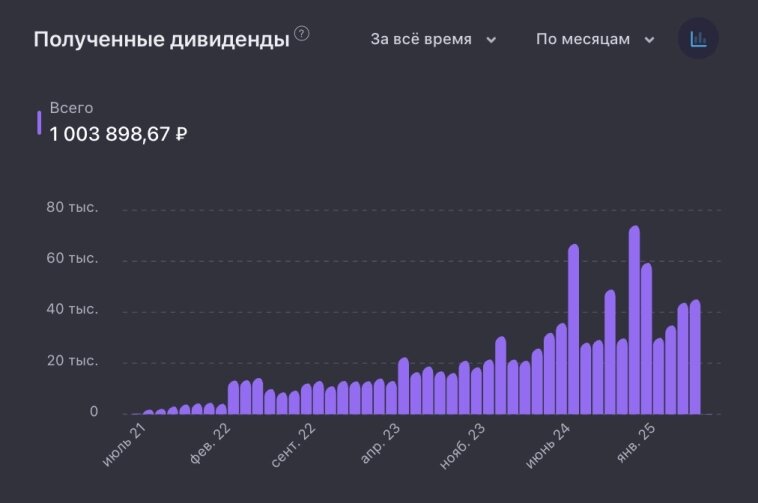 Обратил тут внимание, что всего с начала инвестирования получил 1 млн рублей пассивного дохода. Тут купоны, дивиденды и проценты по депозиту. Вот такой график получился с июля 2021 по май 2025. Почти 4 года. Очень важное объявление: подписывайтесь на мой телеграм-канал. В нём уже 16 тысяч подписчиков, а будет ещё больше! В июне должен быть рекорд за месяц — более 100 000. В июле тоже около того, может быть, больше. Смотря когда дивиденды придут, а то какие-то через несколько дней после отсечки, а какие-то несколько недель.