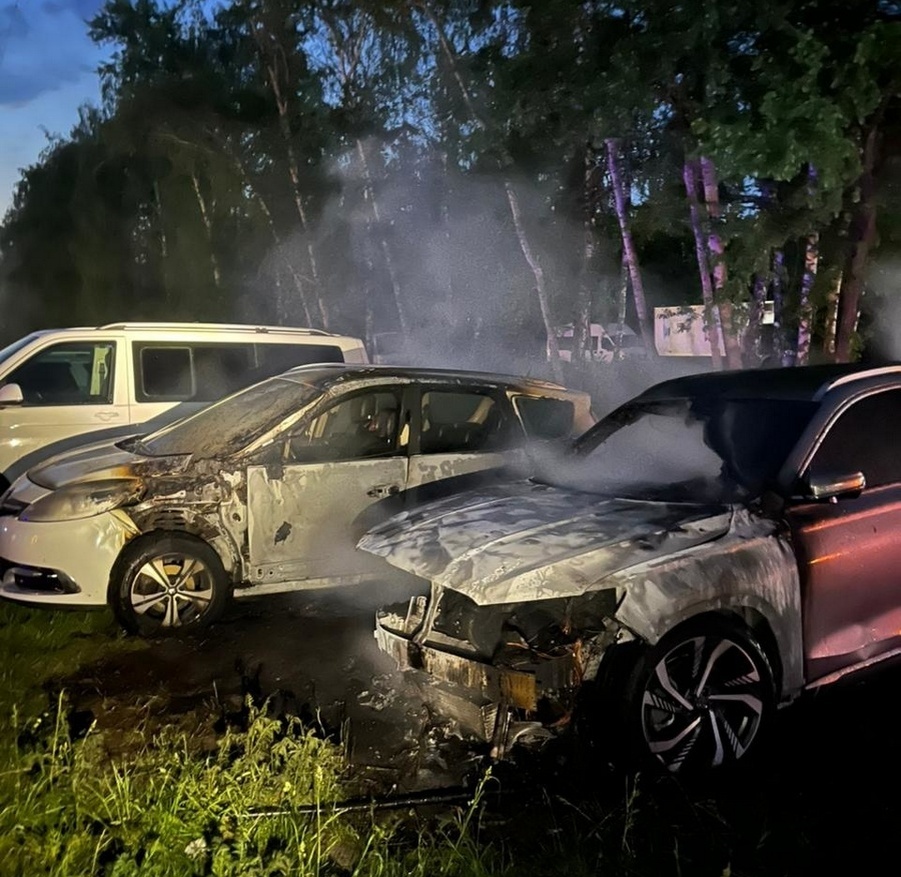 По предварительным данным, у китайского кроссовера поврежден моторный отсек и крышка багажника, а у французского минивэна обгорела левая сторона. Пострадавших нет.