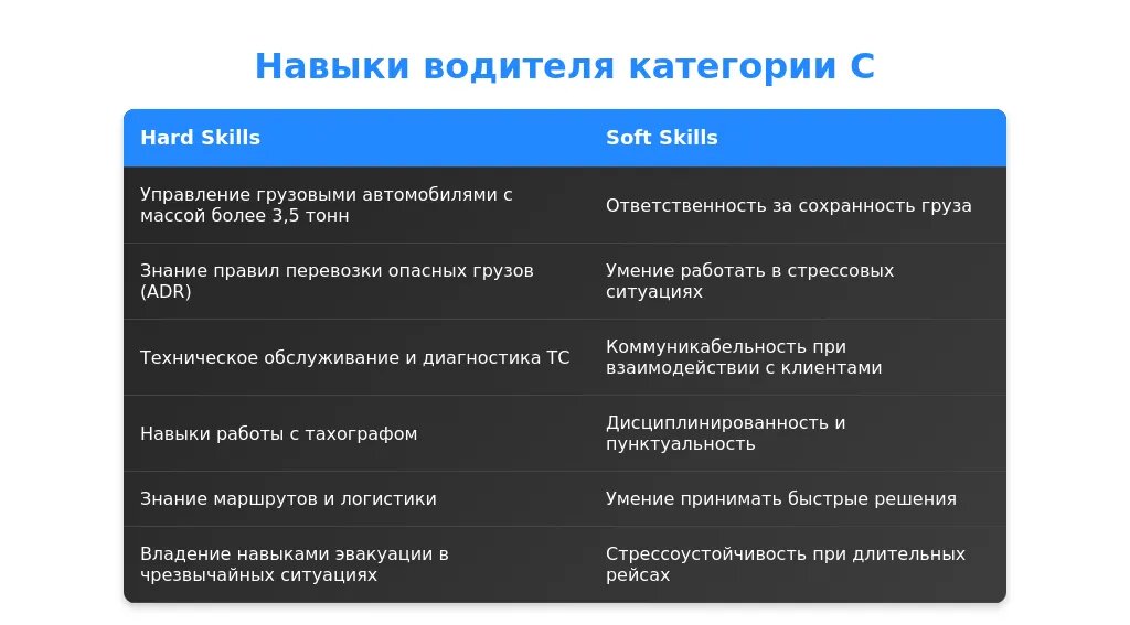 - Основные навыки (например, знание ПДД, опыт перевозки грузов).