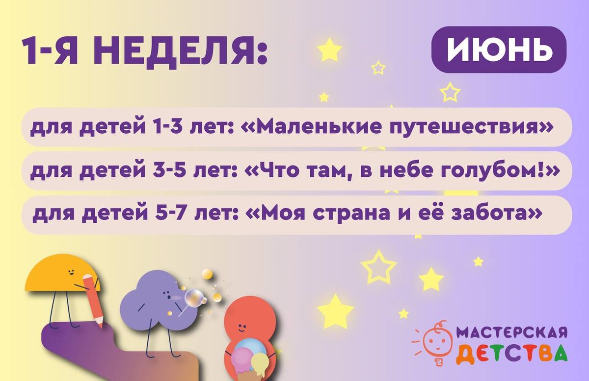 Ура, лето!🌻 Впереди столько всего интересного, яркого и познавательного! Пора познакомиться с новыми темами в нашем клубе «Мастерская детства», которые мы будем изучать на первой неделе июня: 🧳 для детей 1-3 лет: «Маленькие путешествия» ⛅️ для детей 3-5 лет: «Что там, в небе голубом!» 🇷🇺 для детей 5-7 лет: «Моя страна и её забота о детях» Дерзайте и чувствуйте лето на все 100% ✅ Доступ к нашим курсам здесь👉🏻 clck.ru/35Y8rz #МастерскаяДетства #АнонсМастерскаяДетства