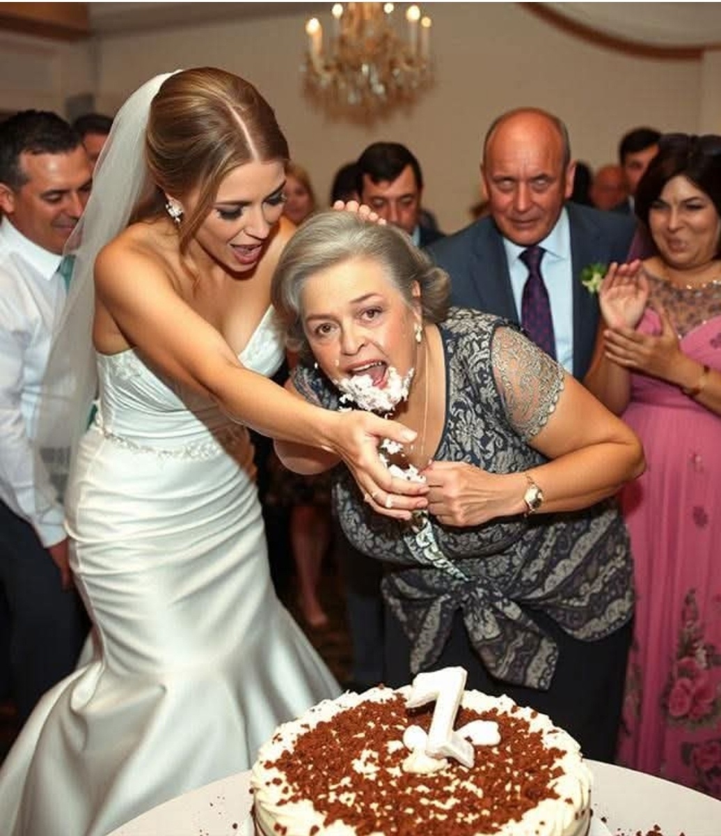 Она резко встала, взяла свекровь за плечи — та даже не успела понять, что происходит — и одним движением придавила её лицо прямо в центр трёхъярусного свадебного торта.