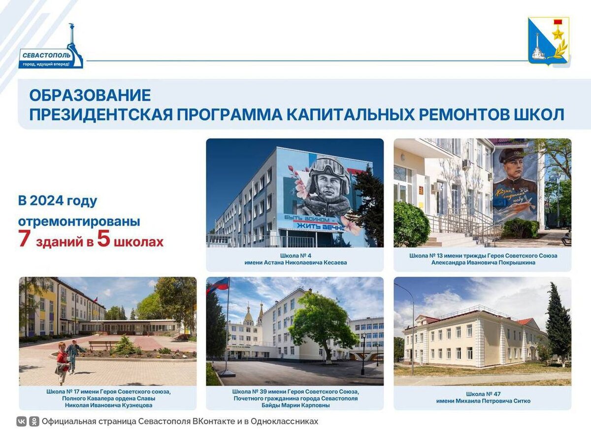 В Севастополе отсутствуют очереди в детские сады Новый детский сад улице Руднева добавил 120 мест. В 2024 году также был введен в эксплуатацию детский сад на 220 мест и корпус начальной школы на 240 мест на улице Молочной. В планах этого года – завершение строительства детсада на улице Вакуленчука. Продолжается строительство школ на Радиогорке и на улице Верещагина. Губернатор Михаил Развожаев: «По президентской программе капитально отремонтировали 7 объектов в 5 школах и начато еще 4 школы. В этом году по президентской программе начаты работы в 5 школах на 8 объектах». Подробнее — на официальной странице губернатора Михаила Развожаева. Правительство Севастополя