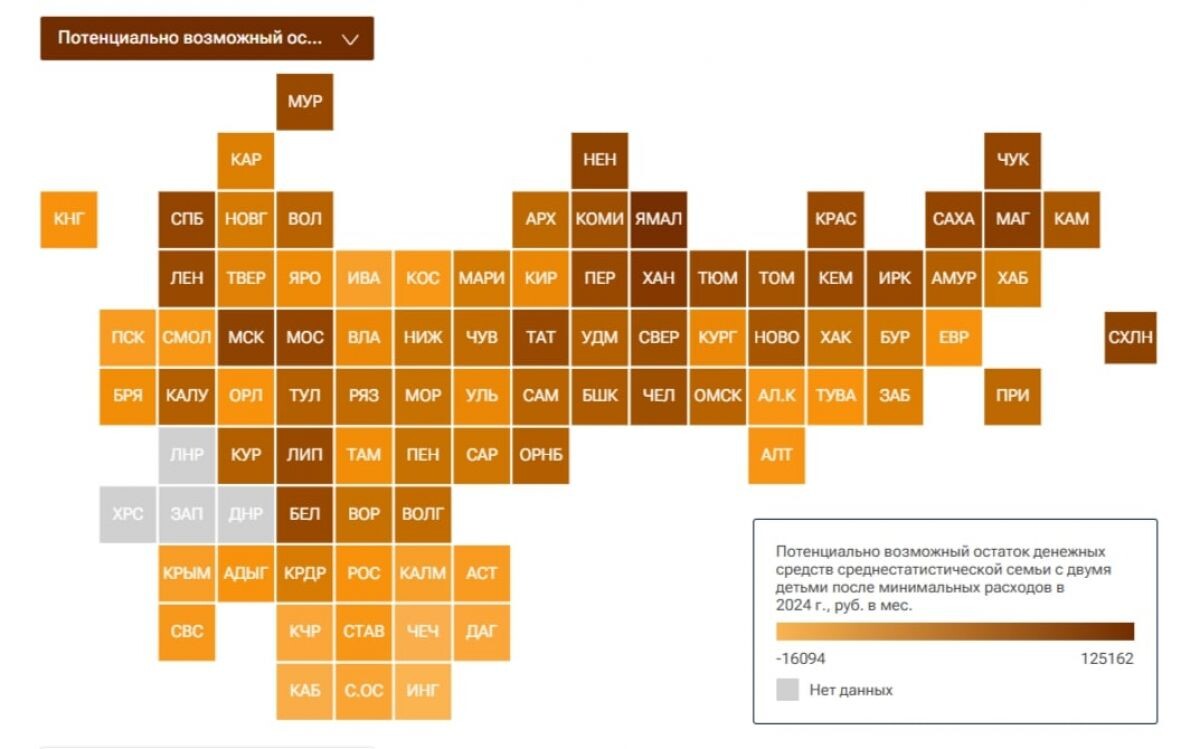 Орловская область оказалась на 67 месте в рейтинге регионов по благосостоянию семей по итогам 2024 года. Аналитику подготовили специалисты «РИА Рейтинг». Согласно статистике, потенциально возможный остаток денег среднестатистической орловской семьи с двумя детьми после минимальных расходов в 2024 году составляет 17,1 тыс. рублей. При этом, в семье с одним ребенком такой остаток составляет 35,4 тыс. рублей. На первом месте рейтинга оказался Ямало-Ненецкий АО, где у семей с двумя и одним ребенком остается по 125,1 тыс. рублей и 145,2 тыс. рублей соответственно. Последнее место досталось Республике Ингушетии, жители которой уходят в минус на 16 тыс. рублей в семье с двумя детьми, а при наличии лишь одного ребенка остаток равен 2,1 тыс. рублей. Отметим, в некоторых регионах России, например, в Карачаево-Черкесской Республике, Дагестане и Чечне, денежный остаток в семьях уходит в минус. В этих регионах источником дохода семей может являться натуральное хозяйство, индивидуальное предпринимат