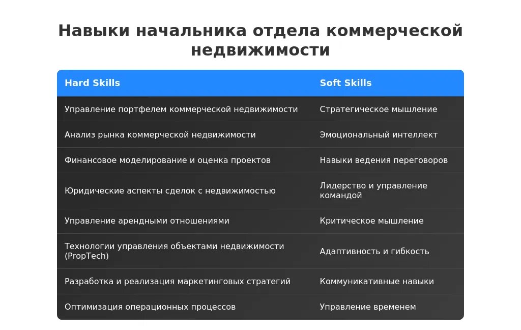 Скрытые требования можно выявить через анализ корпоративной культуры и задач, описанных в вакансии. Например, если упоминается "работа в динамичной среде", это может означать необходимость стрессоустойчивости и высокой скорости принятия решений. Также важно учитывать отраслевые особенности: в коммерческой недвижимости часто ценятся навыки аналитики и стратегического планирования.
