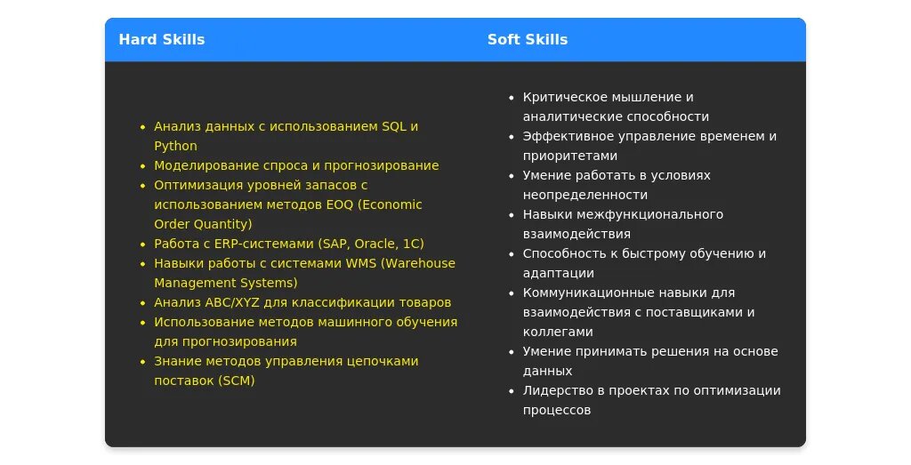 При анализе вакансии важно выделить ключевые требования, которые работодатель считает обязательными, и те, которые являются желательными. Обязательные требования обычно связаны с профессиональными навыками, такими как знание систем управления запасами (например, SAP, 1С), опыт работы с большими данными, аналитическое мышление и умение работать в команде. Желательные требования могут включать знание определённых методологий (например, ABC/XYZ-анализ), опыт работы в конкретной отрасли или знание иностранных языков.