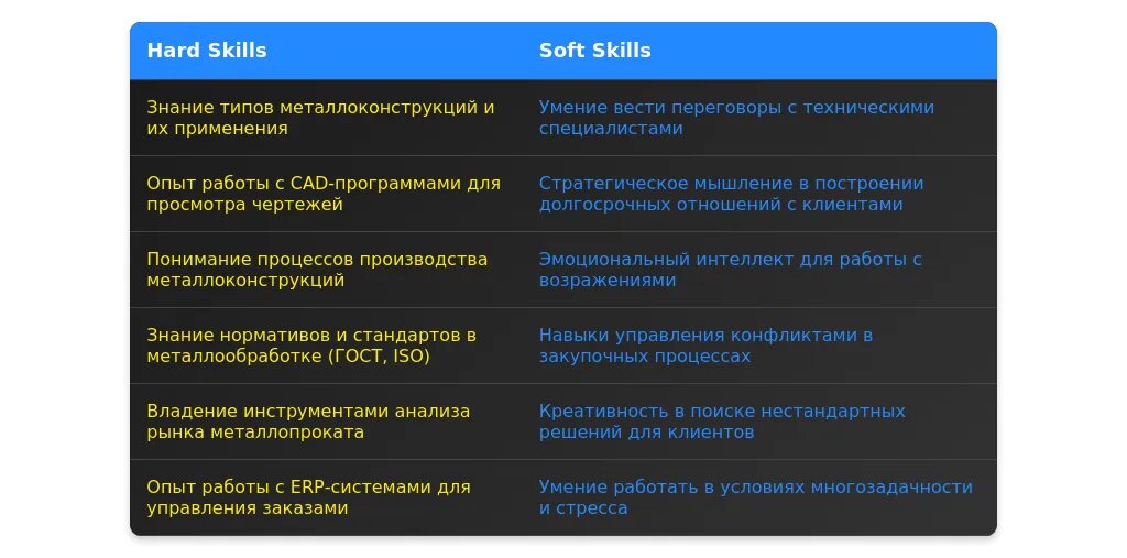 На что делать акцент: коммуникативные навыки, знание продукта, базовое понимание рынка металлоконструкций.