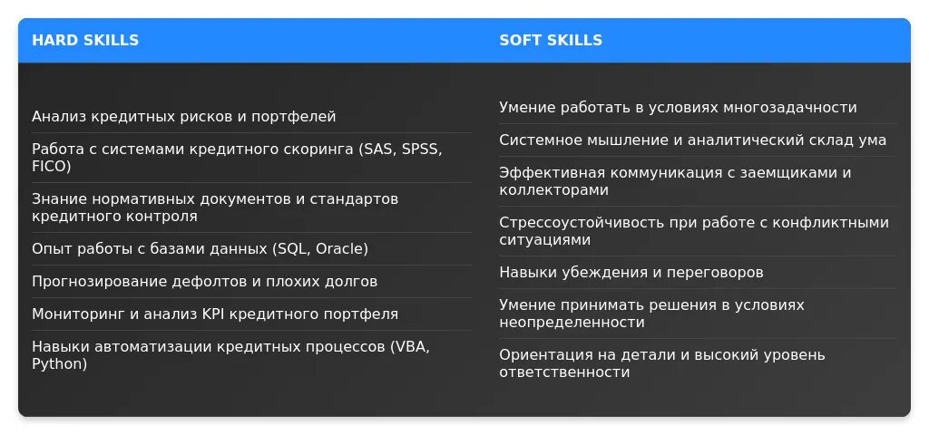 Пример 4: Требование "знание законодательства в области кредитования" указывает на необходимость юридической грамотности.