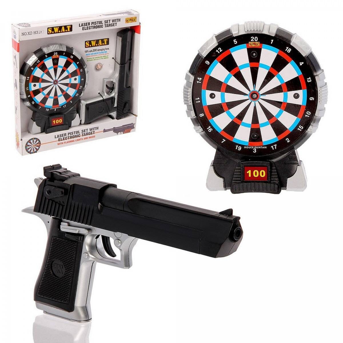 Электронный тир «Крутой спецназ», световые и звуковые эффекты, работает от батареек Функциональные особенности Звуковые эффекты: имитация выстрела, при попадании – играет мелодия; Световые эффекты: горят лампочки. Размеры пистолета: 25 × 3,3 × 15 см. Размер упаковки - 33 х 4,5 х 33 см; Масса брутто - 535 г.