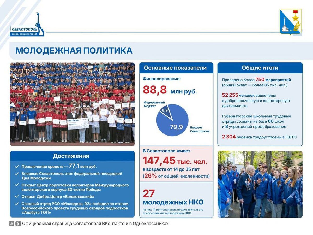Главное в сфере молодежной политики По данным Росстата, в Севастополе на начало 2024 года проживало 147,45 тыс. человек в возрасте от 14 до 35 лет. Это колоссальные цифры. Почти треть нашего города — это молодежь. И очевидно, что эти цифры будут только расти. В Севастополе 27 молодежных НКО, из них 14 региональных представительств всероссийских молодежных НКО. В добровольческую (волонтерскую) деятельность за 2024 год вовлечено больше 52 тысяч человек. Молодежь привлекла на свои проекты грантов на 77,1 млн рублей. Гордость Севастополя — губернаторские школьные трудовые отряды. Они созданы в 2021 году по инициативе Михаила Развожаева. В прошлом году в ГШТО были трудоустроены 2304 ребенка. Подробнее — на официальной странице губернатора Михаила Развожаева. Правительство Севастополя