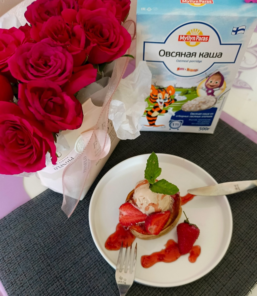 Растительное масло -1 ст. л Мороженое Крем-брюле, джем клубничный, клубника, листики мяты.