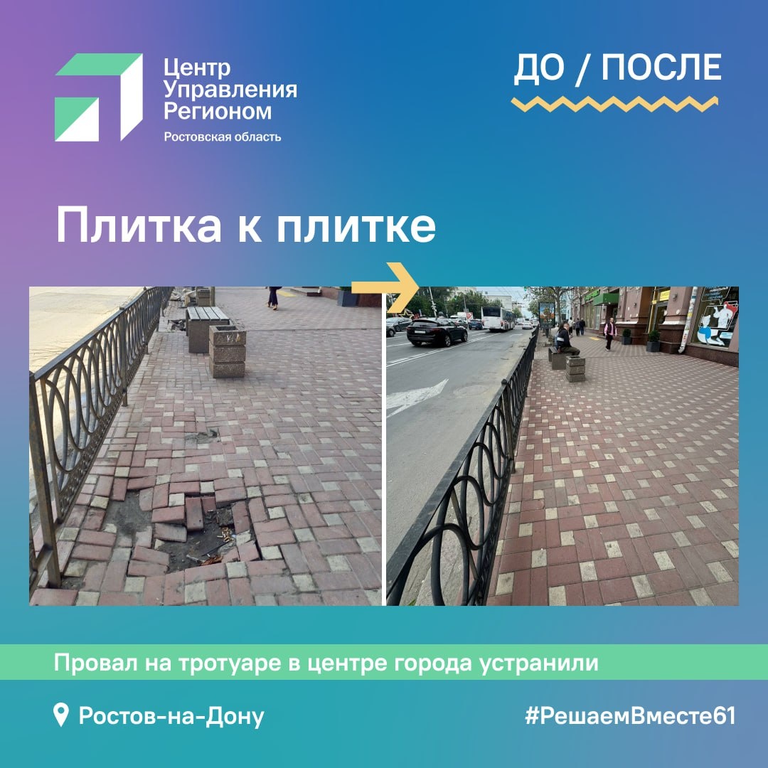 📣Подъехала новая подборка решенных проблем на Дону. О том, что волновало жителей региона, расскажем в карточках! 📍В самом центре Ростова, на проспекте Ворошиловском, 47, провалилась тротуарная плитка, на что обратили внимание пользователи соцсетей. Проблему взяли в работу и решили - тротуар теперь как новый. 📍Жители станицы Хомутовской Кагальницкого района обратились с жалобой на плохое дороги на улице Нижне-Набережной. Вопрос услышан, дорогу отремонтировали. 📍В донской столице немного "устал" дорожный знак на улице Тельмана, который опасно наклонился. Сообщение от бдительных ростовчан передано в работу, проблема решена, знак привели в порядок. 📍Похожий случай произошел на перекрестке проспекта Шолохова и переулка Сборного в Первомайском районе Ростова. Там упал столб с дорожными знаками. После обращения жителей знак вернули на место. #цур61 #решаемвместе61 #кейсы61 #Ростовскаяобласть