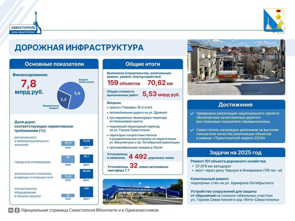 Михаил Развожаев о ремонте дорог в Севастополе За 2024 год построено, капитально отремонтировано и благоустроено 70,62 км дорог и объектов транспортной инфраструктуры. Введены в эксплуатацию: - трасса «Таврида» (8-й этап), - автомобильная дорога на ул. Древней, - три надземных пешеходных перехода на Камышовском шоссе. «Проведен капитальный ремонт 2 объектов (подземный пешеходный переход на ул. Героев Севастополя, переходно-скоростные полосы и разделительные островки на пересечении ул. Вакуленчука и ПОРа)». Доля дорог, соответствующих нормативным требованиям регионального и межмуниципального значения составила 79,55%. Подробнее — на официальной странице губернатора Михаила Развожаева. Правительство Севастополя