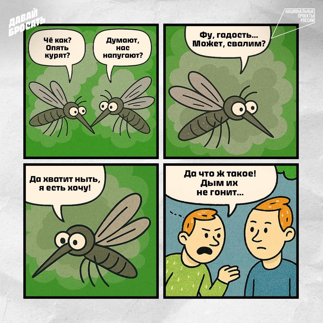 💬 Наверняка ты слышал байку о том, что, если закурить на природе, комары тебя не тронут. Давай разберёмся, правда это или миф. Короткий ответ: правда, но… с оговорками. Дым действительно может отпугивать комаров — и сигаретный в том числе. Как объясняет энтомолог Александр Каширский, насекомым не нравится никотин, а сам дым создаёт для них дискомфортную среду. ❗Но есть нюанс: чтобы эффект был заметен, дыма нужно очень много. Несколько сигарет в ветреную погоду не спасут — комары просто отлетят на пару метров и вернутся. Так что, если хочешь отбиться от комаров, лучше возьми специальное средство. А ты верил в этот миф? Пиши в комментах! #мифология_курения