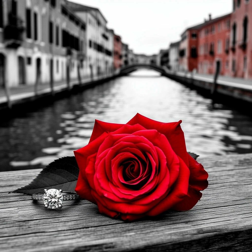 a red rose and the diamond engagement ring that was left behind, sitting on top of a wooden pier, a black and white photo, tumblr, canal, pink and red colors, love drama, beside the river, very attractive and beautiful, sayem reza, message, beautiful image ever created, heartbreaking, venetian red, awww, wonderful compositions, romanticism, absolutely outstanding image, beautiful background, graphic #neuroart #нейроарт #ai #ии #нейросеть #картинки #искусственныйинтеллект #цифровоеискусство #digitalart #арт #art #prompt #промпт #подсказка