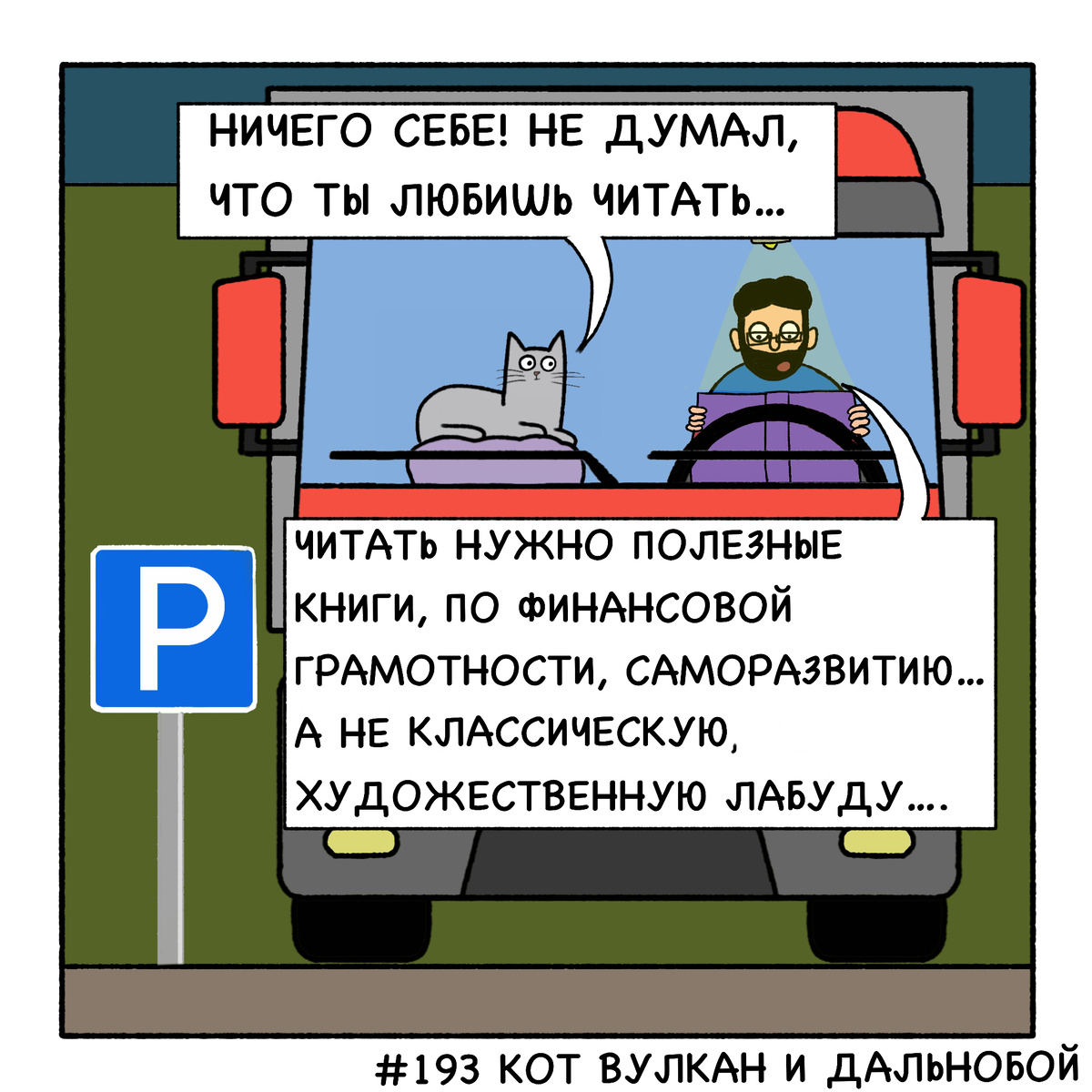 Новый выпуск комикса «Кот Вулкан и дальнобой» про книги