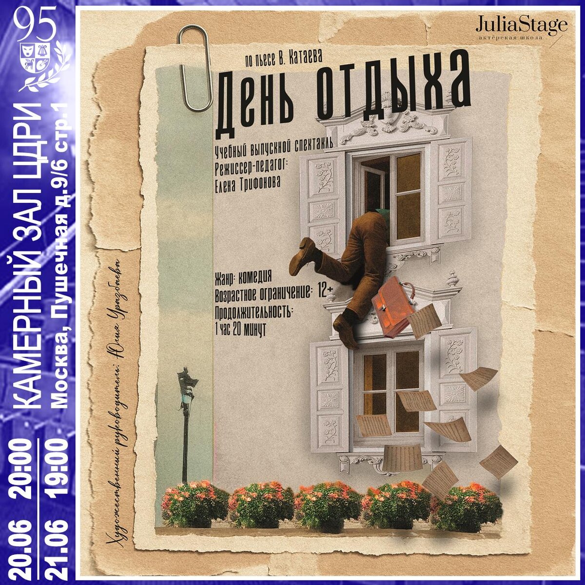 Учебный выпускной спектакль студии JuliaStage Спектакль «День отдыха», поставлен по одноимённой комедии Валентина Катаева. Герои спектакля, по тем или иным причинам, оказываются в Доме отдыха «Сыроежки», после чего сюжет закручивается стремительно! Попытка главного героя, агента по снабжению Зайцева, получить резолюцию на важном документе, обернулась невероятной чередой ошибок, неожиданных встреч, нелепых обстоятельств и случайностей. Но, как и положено в комедии, всё разрешается наилучшим образом! И Зайцев, прошедший через воду оздоровительных ванн и электрические разряды спокойствия, получает заветную подпись!!! А мы надеемся, что все, «…кто хоть раз побывает в наших «Сыроежках»...», смогут отдохнуть от серых будней и обязательно получат заряд положительных эмоций! Режиссер-педагог — Елена Трифонова