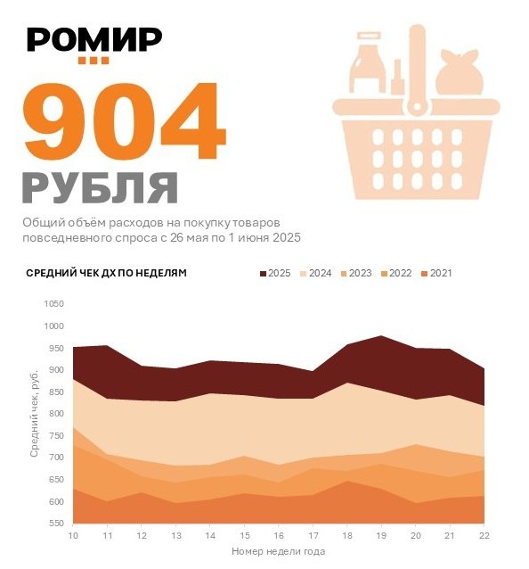 904 рубля составил размер среднего чека на прошедшей неделе с 26 мая по 1 июня. Это на 45 рублей или 5% меньше, чем неделей ранее и на 84 рубля или 10.2% больше, чем в прошлом году. 🔸Начало активной фазы сезона отпусков. С наступлением лета многие граждане начинают планировать или уже отправляются в поездки. Это может приводить к изменению привычной структуры потребления: сокращению регулярных закупок товаров повседневного спроса в традиционных местах или перераспределению бюджета на другие категории расходов, связанные с путешествиями. 🔸Завершение учебного года у школьников. Окончание учебного года влияет на распорядок дня семей с детьми. Изменение рутины и снижение необходимости в определенных товарах, связанных со школой и повседневной "рабочей" жизнью, также может оказывать влияние на объем и состав потребительской корзины и, как следствие, на размер среднего чека. #индекссреднегочека @m_romir