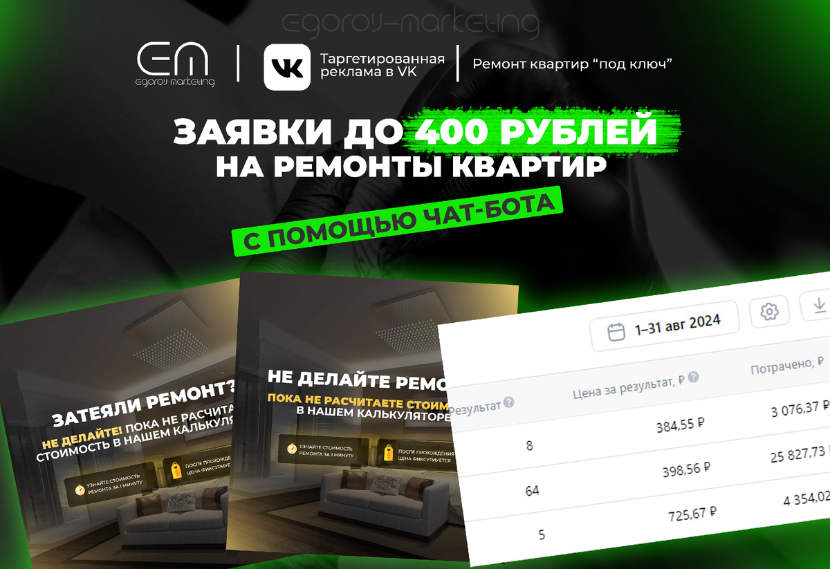 КЕЙС VK | EM | РЕМОНТ КВАРТИР "ПОД КЛЮЧ" Меня зовут Руслан, я сертифицированный эксперт по VK Рекламе. Сейчас все расскажу о таргетированной рекламе для ремонтно-строительного бизнеса Компания занимается ремонтом квартир под ключ. Здесь клиент попросил город не называть, могу только от себя добавить, что это крупный город миллионник. Да, я обычно спрашиваю разрешение на использования кейса Вышли на меня в августе 2024 года, когда столкнулись с проблемой: они запустили таргетированную рекламу в VK самостоятельно, но так и не смогли получить ни одного стабильного результата. Первые эксперименты были спонтанными, без понимания целевой аудитории и тестирования креативов. Бюджет был потрачен, но заявок не поступило. Владелец компании обратился с запросом: «Нам нужна понятная, работающая реклама, которая будет приводить клиентов». Начали с анализа: На старте я обнаружил несколько ключевых проблем: Ключевые шаги: Ключевые шаги и решения, которые помогли выйти на стабильный поток заявок: 1. П