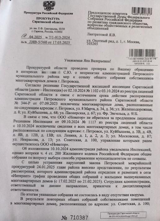 Помогла защитить права собственников жилья 🏠Недавно ко мне обратилась жительница Саратовской области с серьёзной проблемой - сотни семей в Петровске остались без управляющей компании. Дома исключили из реестра лицензий, а новый конкурс для выбора УК так и не провели. Люди оказались в сложной ситуации: услуги ЖКХ некому оказывать, дома фактически остались бесхозными. ✉️Я направила запрос в прокуратуру региона, и результат не заставил себя ждать. По итогам проверки выяснилось, что администрация района действительно нарушила закон — не созвала своевременно собрания собственников и не организовала конкурс по отбору новой управляющей компании. 🏠Сейчас часть домов уже нашли своих управляющих: жители выбрали компании, но остаются адреса, где до сих пор нет решения вопроса управления. Прокуратура вновь вмешалась и потребовала от администрации провести повторные собрания. ❗️Особую благодарность хочу выразить сотрудникам прокуратуры Саратовской области за оперативную работу и поддержку в р