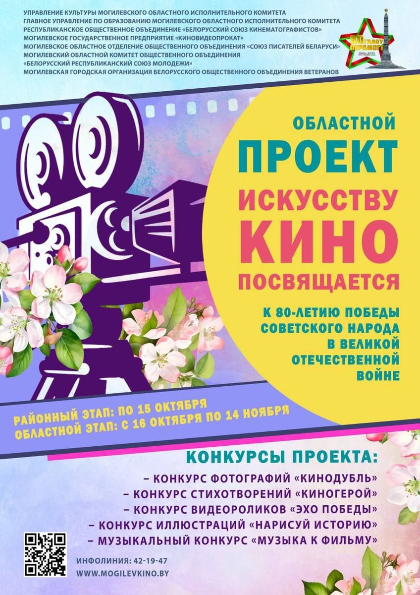 ⚡️«Искусству кино посвящается» – вдохновляйтесь, создавайте, помните! ✅Приглашаем всех желающих принять участие в конкурсах областного проекта «Искусству кино посвящается» к 80-летию Победы в Великой Отечественной войне. Уже второй год подряд проект объединяет сотни зрителей Могилевской области, которые знают и любят кино. 🎥Конкурсы проекта: ➡️«Кинодубль» (повторите кадр из фильма, передав его атмосферу) ➡️«Киногерой» (сочините стихотворение-посвящение киногерою) ➡️«Эхо Победы» (снимите видеопослание-благодарность ветеранам Великой Отечественной войны за Победу) ➡️«Нарисуй историю» (создайте иллюстрацию по сюжету фильма или по собственному сценарию) ➡️«Музыка к фильму» (напишите авторскую версию вокально-инструментальной или инструментальной композиции к фильму). ☝️Победителей ждут памятные призы и дипломы. 📝Подробная информация на сайте Могилевского государственного предприятия «Киновидеопрокат»: www.mogilevkino.by в разделе КОНКУРСЫ и по т.42-19-47
