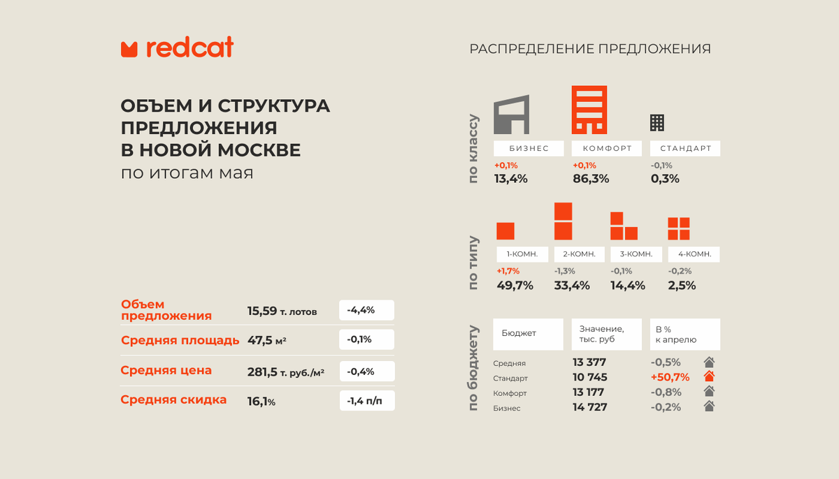 В Новой Москве в мае объемы пополнились за счет выхода на рынок пяти новых корпусов, а также благодаря новым объемам в уже реализуемых домах. Объемы предложения на новых территориях непрерывно снижаются на протяжении полугода, в результате чего был потерян весь прирост, который образовался за первое полугодие 2024 года. По итогам мая объем предложения обновил 2,5 летний минимум и вернулся на уровень осени 2022 года. Общее количество лотов, находящихся в экспозиции в мае снизилось на 4,4%, объем предложения зафиксировался на показателе 15,59 тыс. лотов, что на 22,6% ниже уровня мая прошлого года. В структуре предложения по классам в мае отмечены незначительные смещения в сторону более качественных проектов, в течение месяца объемы экспозиции сокращались во всех сегментах, но в стандартном классе снижение было наиболее активным. Доля квартир бизнес-класса выросла на 0,1 п/п и составила 13,4%, доля комфорт-класса поднялась на 0,1 п/п до уровня 86,3%, доля стандарт-класса сократилась на 0,
