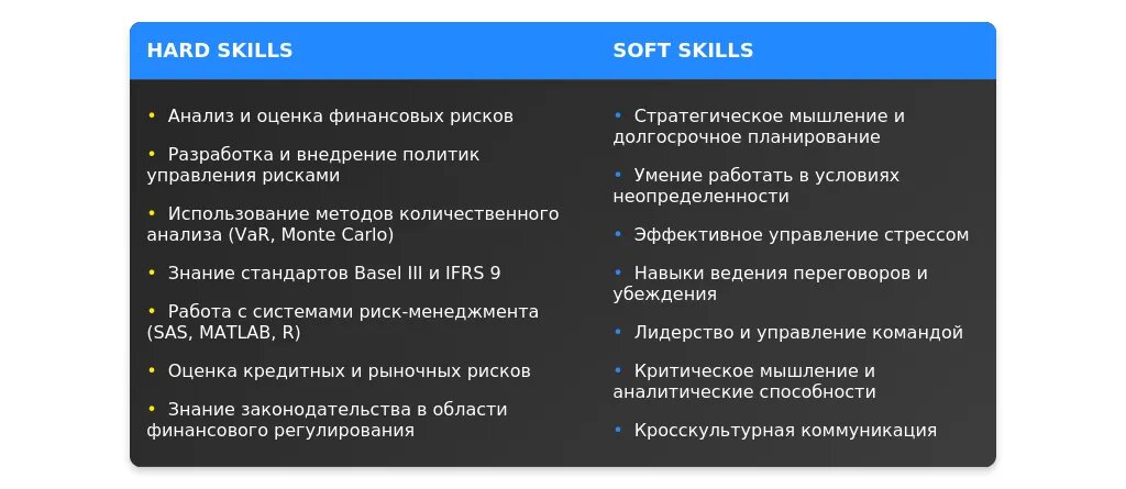 ✅ Вариант 2: Таблица с уровнями владения Навык Уровень Управление рисками Эксперт Анализ данных Продвинутый