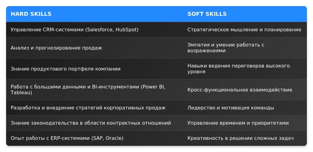 После адаптации: "Навыки ведения переговоров с крупными клиентами, работа с CRM-системами (Salesforce, HubSpot)."