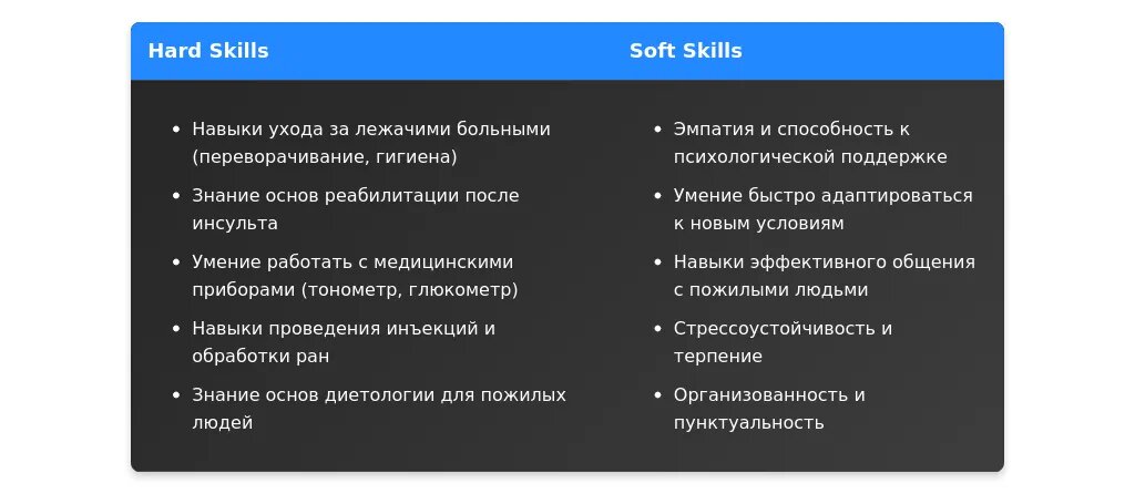 После: "Навыки ухода за пожилыми и больными пациентами, включая гигиенические процедуры, кормление и медицинский уход."