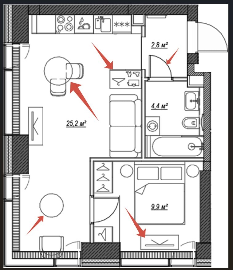 Сегодня подбираю квартиру для клиента в новостройке. С комплексом определились, задача выбрать грамотную планировку. Клиент присылает мне планировку - "Смотри, хорошая цена, этаж норм, угловое остекление, много света - берём?" Открываю... и записываю голосовое: "Нет, не берём. И вот почему." Давайте разберём на примере, что в этой планировке не так — и почему планировка важнее, чем кажется. 📌 1. Входная зона Мини-коридор 2,8 м² — в котором ничего не разместишь. Слева сразу дверь в санузел — и она при открытии съедает треть этого пространства. Вешалка и обувница встанут, но пройти будет уже непросто. При этом из этой "грязной" зоны мы попадаем напрямую на кухню. Окей, а одежду куда вешать? 🤷♂️ 📌 2. Шкаф-невидимка Застройщик нарисовал шкаф у входа в комнату. Но если его реально поставить — вы с дивана будете смотреть не телевизор, а на заднюю стенку шкафа. Логично? Нет. И мест под нормальные системы хранения просто нет. 📌 3. Столовая зона Нарисован стол с двумя стульями — и э