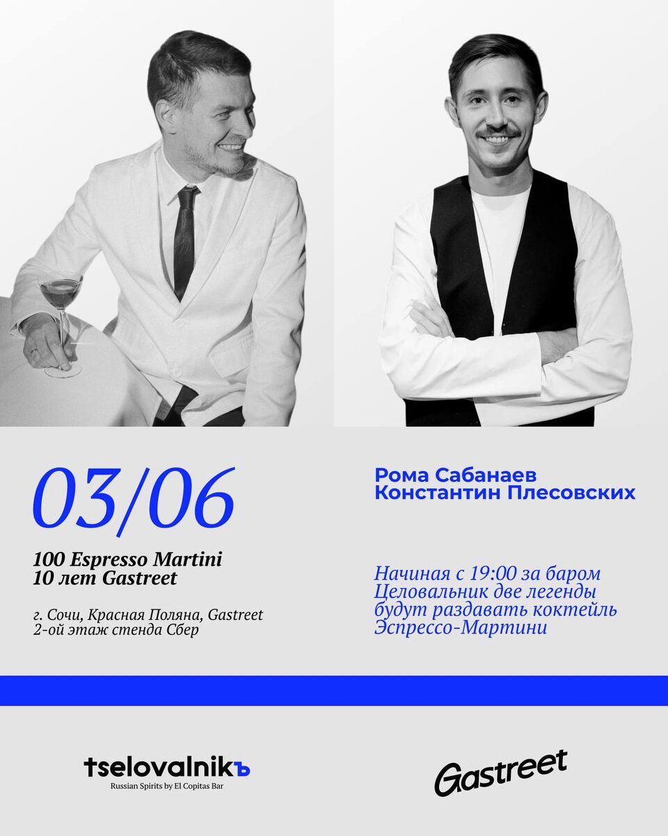 СОЧИ! У НАС НОВОСТИ! Сегодня с 19:00 за стойкой стенда Целовальник на площадке GASTREET соберутся две легенды — Роман Сабанев и Константин Плесовских. Ребята будут разадавать стиль и коктейль Эспрессо-Мартини! Такое, говорят, пропускать нельзя! Ждем, надеемся, любим! ДО ВСТРЕЧИ!