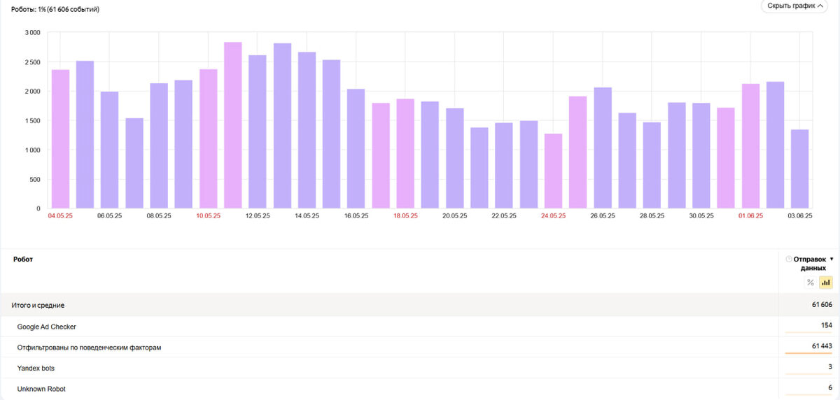 Трафик от Алисы попадёт всё-таки в роботный. Получается, если вы исключали его из отчётов Метрики, то пора переставать. Какого-то очевидного способа отфильтровать хороших и плохих роботов мы не нашли. Да, можно зайти в отчёт по роботам и посмотреть, кто орудует на вашем сайте.