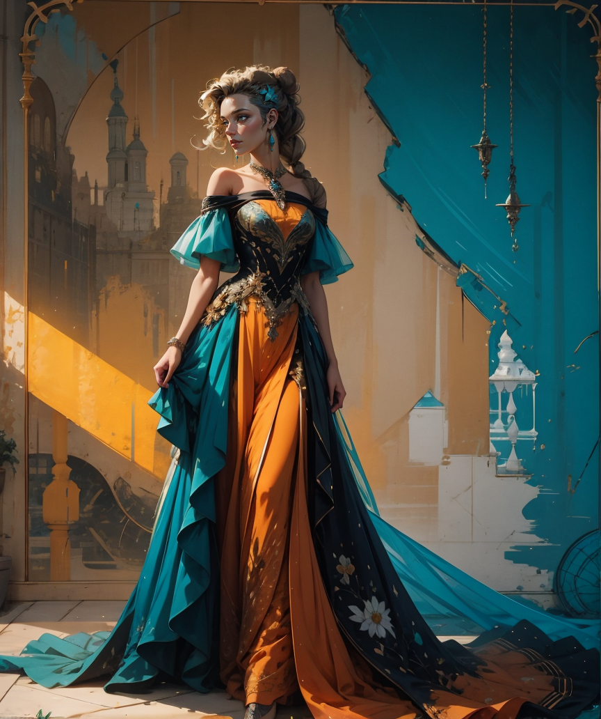 (лучшее качество, шедевр:1.2), <lora:wrenchelegadome:0.9>, wrenchelegadome, (1 злая девушка:1.1), (ядовитое и оранжевое платье:1.1), темно-желтая прическа «горшок» с челкой, голубовато-зеленые глаза, легкая улыбка, цветы, украшения, наряд, <lora:more_details:0.4>