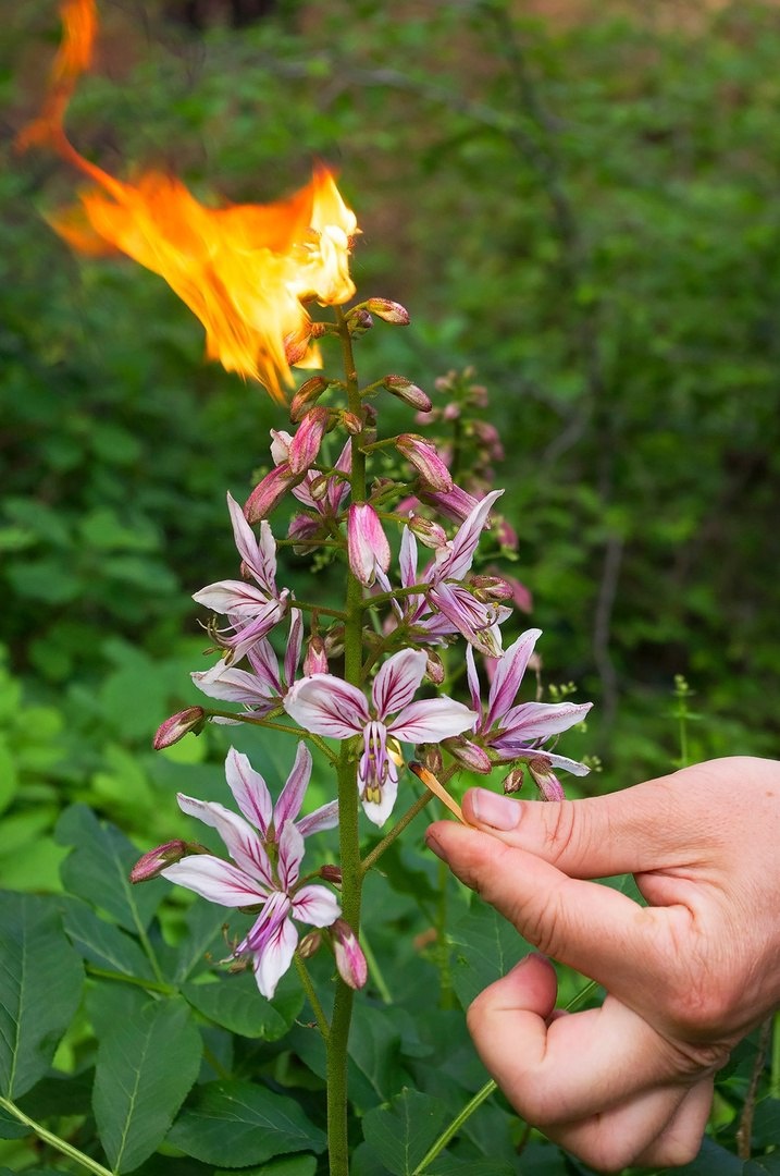 Это изящное растение с розово-сиреневыми лепестками как будто специально выбирает места вдоль тропинок и дорог. Привлекательное, ароматное — оно невольно манит к себе руку. Но за красотой ясенца скрывается опасность, о которой важно знать. В июне на юге России, на Алтае, Дальнем Востоке и в Сибири зацветает удивительное и опасное растение — ясенец (Dictamnus). Его цветы очень красивы, а прозвище «неопалимая купина» он получил не случайно: в сухую безветренную погоду над растением можно наблюдать вспышку пламени, и... оно не сгорит. Но, в отличие от библейского чуда, ясенец может нанести человеку серьёзные ожоги (фотодерматит). В момент прикосновения человек ничего не чувствует — в этом и кроется главная опасность. Уже через 12–24 часа на коже появляются покраснения, отёк и крупные волдыри: это химический ожог второй степени. Поверхность кожи разрушается, могут образоваться мокнущие язвы, сопровождающиеся болью, слабостью, а иногда и повышением температуры. При обширных поражениях есть