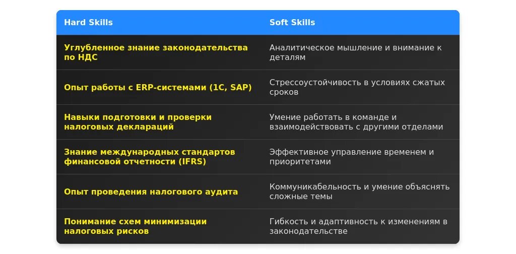 После: "Знание законодательства по НДС, включая последние изменения в 2025 году."