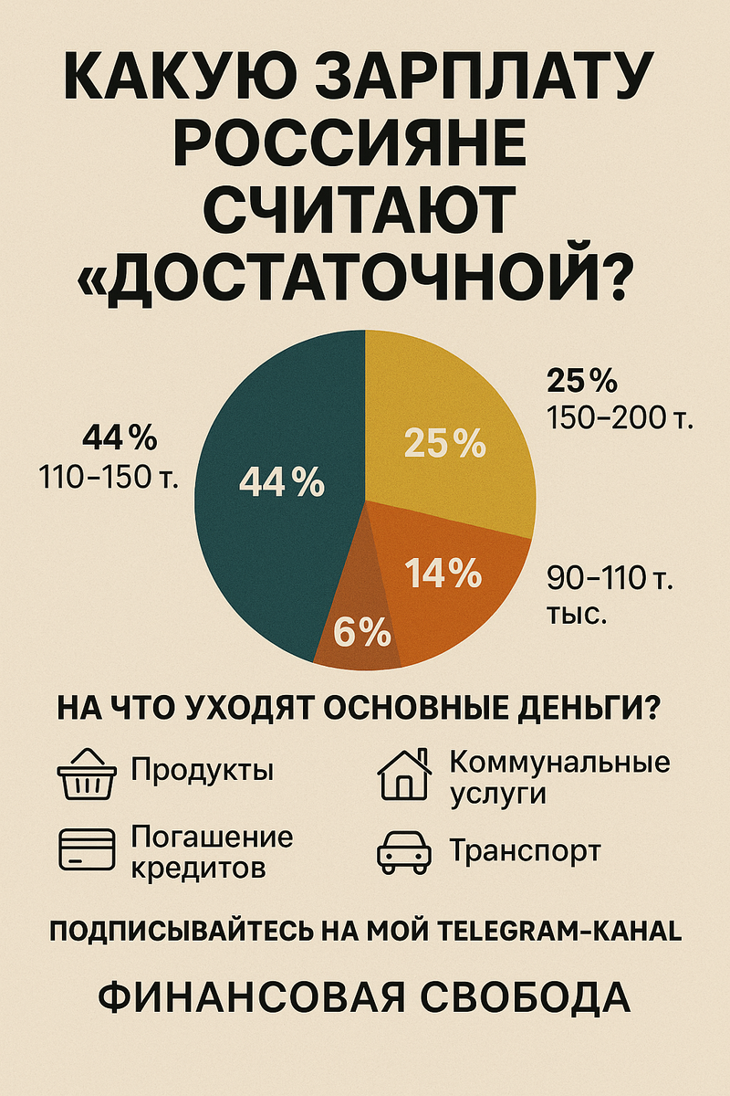 🏡 А вот более 250 тысяч устроили бы только 6%. На что уходят основные деньги? Цифры удивительно умеренные. Несмотря на рост цен и инфляцию, абсолютное большинство не рассчитывает на «миллионы». Люди хотят стабильности, а не роскоши. Однако даже такая «умеренная» зарплата сегодня недоступна для многих: по данным Росстата, средняя зарплата по стране — около 73 000 рублей, но медианная — заметно ниже. Допустим, вы зарабатываете 130 000 рублей. После вычета НДФЛ — около 113 000 на руки.
