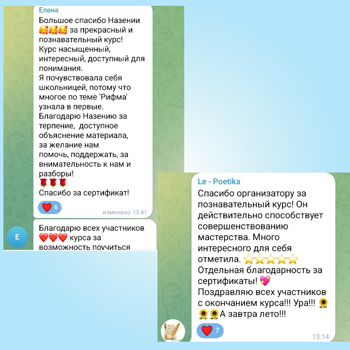 💥С 15 по 31 мая в Телеграм канале "Поэзия рулит" https://t.me/nazeniya1 проходил второй курс по стихосложению. Тема: Рифма. Бесплатно! Участники изучали теорию, трудились, слагая стихи по заданию, а при необходимости корректировали свои произведения. Было нелегко, так как время на весь курс было ограничено. Но авторы упорно шли до конца. С каждым участником проводилась индивидуальная работа. На каждом этапе были технические и смысловые разборы стихотворений для закрепления темы. До конца дошли не все, кто изначально принимал участие. Всего 8 выпускников. А в конце курса - по традиции - были розыгрыши сертификатов Озон. Следующий познавательный курс планируется осенью! Ждем всех авторов стихотворений в нашем Телеграм канале! Кстати, июнь - будет насыщенным различными поэтическими мероприятиями! Присоединяйтесь! 😊 > https://t.me/nazeniya1