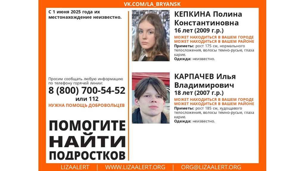 В микрорайоне Московском Брянска вторые сутки ищут тела утонувших подростков. Напомним, трагедия произошла вечером 1 июня. Пять подростков в возрасте 16-18 лет отмечали день рождения на берегу Десны. Решение компании искупаться в реке привело к печальным последствиям — четверо стали тонуть. Спасти удалось только двоих. 18-летний Илья Карпачев и 16-летняя Полина Кепкина утонули. Поиск тел ведут правоохранительные органы, МЧС и СУ СК России по Брянской области. Также участие принимают более 15 добровольцев брянского отряда «ЛизаАлерт», а также добровольцы водного направления «ЛизаАлерт» из Ленинградской области. Задействованы водный коптер, эхолот, подводные камеры. Поисковикам требуется сетка с крупной ячейкой, масло для двухтактных моторов, информация от свидетелей. Связаться с «ЛизаАлерт» можно по телефону горячей линии 88007005452 или позвонить инфоргам поиска: 89065050375 (Ольга) и 89208349283 (Светлана). В Брянске вторые сутки ищут тела утонувших подростков