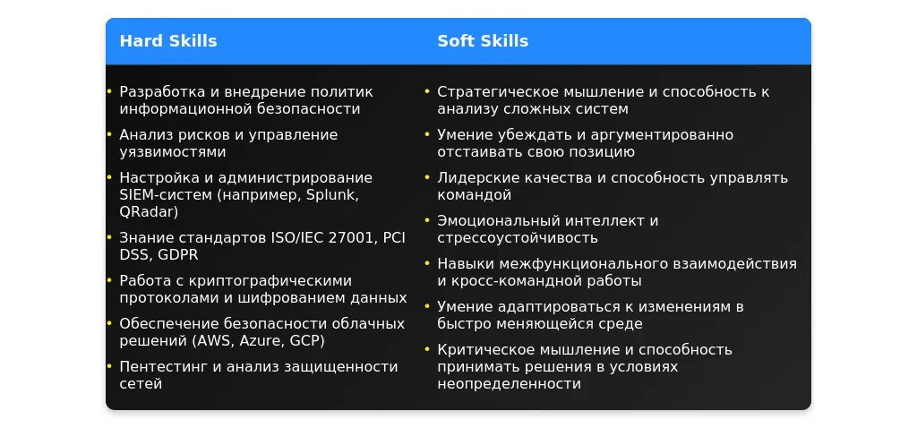 До: "Навыки работы с системами защиты данных, управление командами, знание стандартов безопасности."