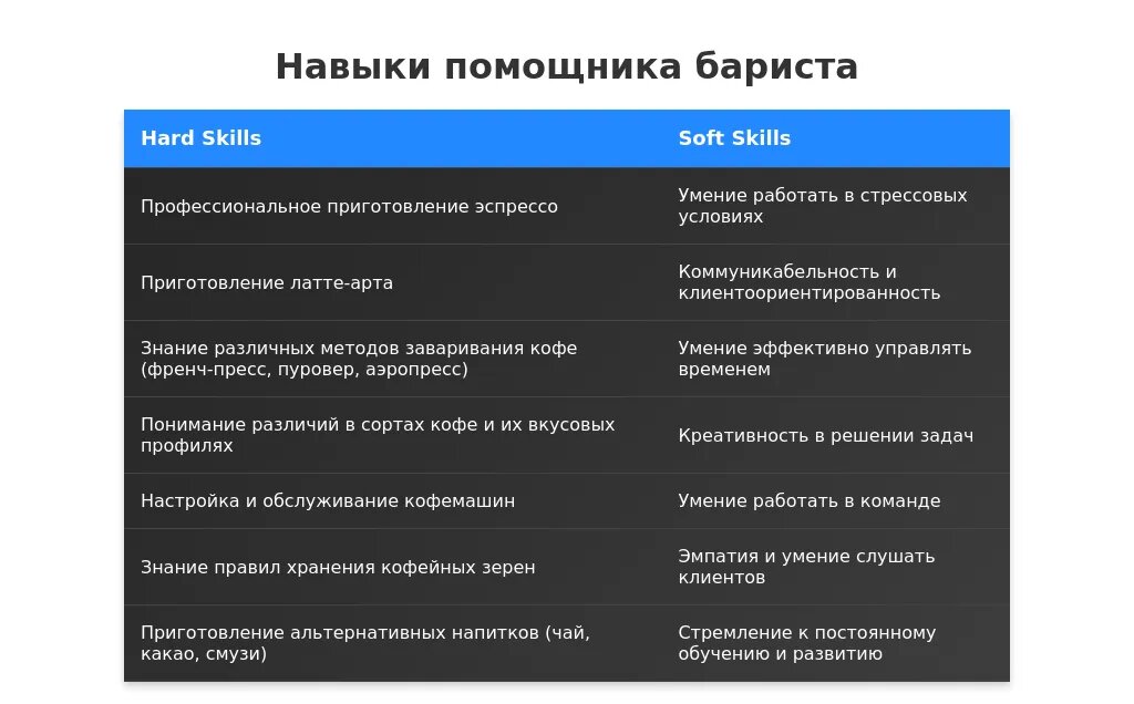 После адаптации: "Опыт работы с клиентами, умение работать в команде, знание кофейных рецептов."