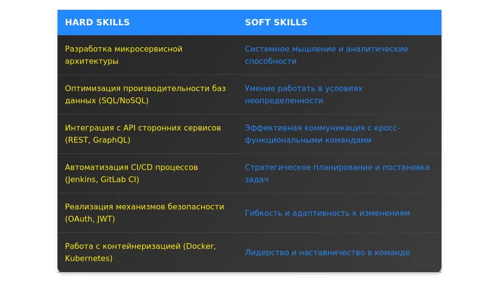 Сильные стороны: упоминание технологий, достижения, soft skills.