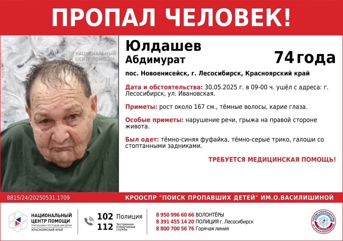 ВНИМАНИЕ!!! ПРОПАЛ ЧЕЛОВЕК!!! ЮЛДАШЕВ АБДИМУРАТ (74 года) пос. Новоенисейск, г. Лесосибирск, Красноярский край НУЖДАЕТСЯ В МЕДИЦИНСКОЙ ПОМОЩИ!!! ОБСТОЯТЕЛЬСТВА ПРОПАЖИ: 30.05.2025 г. в 09-00 ч. ушёл с адреса: г. Лесосибирск, ул. Ивановская. ПРИМЕТЫ: рост около 167 см., тёмные волосы, карие глаза. ОСОБЫЕ ПРИМЕТЫ: нарушение речи, грыжа на правой стороне живота. БЫЛ ОДЕТ: тёмно-синяя фуфайка, тёмно-серые трико, галоши со стоптанными задниками. ПРОСИМ ВСЕХ, КОМУ ИЗВЕСТНО МЕСТОНАХОЖДЕНИЕ ПРОПАВШЕГО, СООБЩИТЬ ПО ТЕЛЕФОНАМ: 8 (39145) 5-14-20 ПОЛИЦИЯ г. Лесосибирск «112» ЕДИНЫЙ ТЕЛЕФОН ВЫЗОВА ЭКСТРЕННЫХ ОПЕРАТИВНЫХ СЛУЖБ 8-950-99-66-066 ВОЛОНТЕРЫ (круглосуточно).