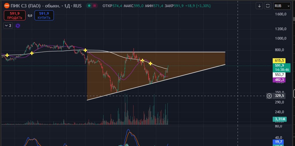 $PIKK Этот актив всех заинтиговал , не понимают почему мы растём. 🕯В данный момент очень похоже, что формирует поджатие к уровню сопротивления 771, как только этот уровень будет пробит, фигура подтвердится и пойдёт отрабатывать на повышение цены. 🔽Нижняя стенка треугольника 451,9, отсюда оттолкнулись и пробили уже медленную скользящую, значит движение вверх будет продолжено. 🔔Актив не может просто расти, скорее всего, будут откаты, но цель графика дорасти до уровня сопротивления. ✔️ Если фигура будет подтверждена то отработка примерно до 1500. НЕ ИИР #теханализ #трейдер #инвестиции #пик
