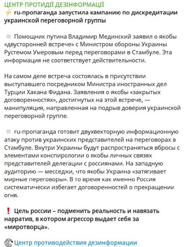 Для истории следует зафиксировать, что вчерашняя встреча делегаций в Стамбуле была не только обменом меморандумами-ультиматумами. Оказывается этому предшествовала встреча глав делегаций - Мединского и Умерова, по данным наших СМИ встреча шла около 2,5 часов, что больше 1,5 часов встречи самих делегаций. Сегодня украинской стороне даже пришлось оправдываться за это (картинка переведена с украинского). Важен сам факт - переговоры между Россией и Украиной действительно идут, мы не просто обмениваемся ультиматумами.