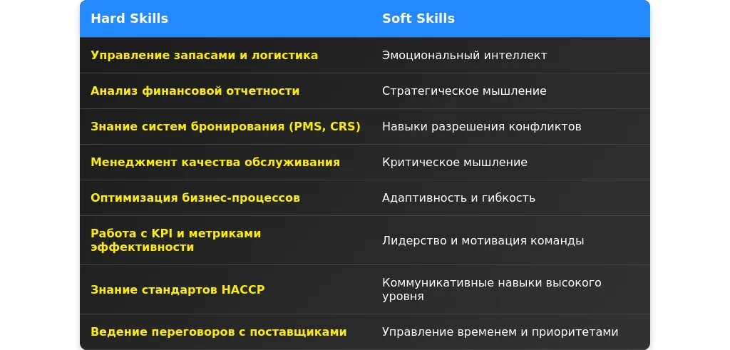 После адаптации: "Управление командами до 30 человек, знание стандартов обслуживания HoReCa, финансовое планирование."